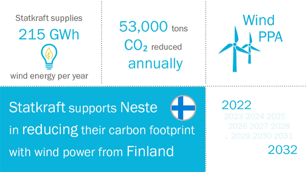 Deliveries to Neste's Porvoo refinery in Finland will start mid-2022 and the annual total volume of the wind power agreement is approximately 215 GWh, corresponding to some 18 percent of the electricity consumption at Neste's refinery in Porvoo, Finland.